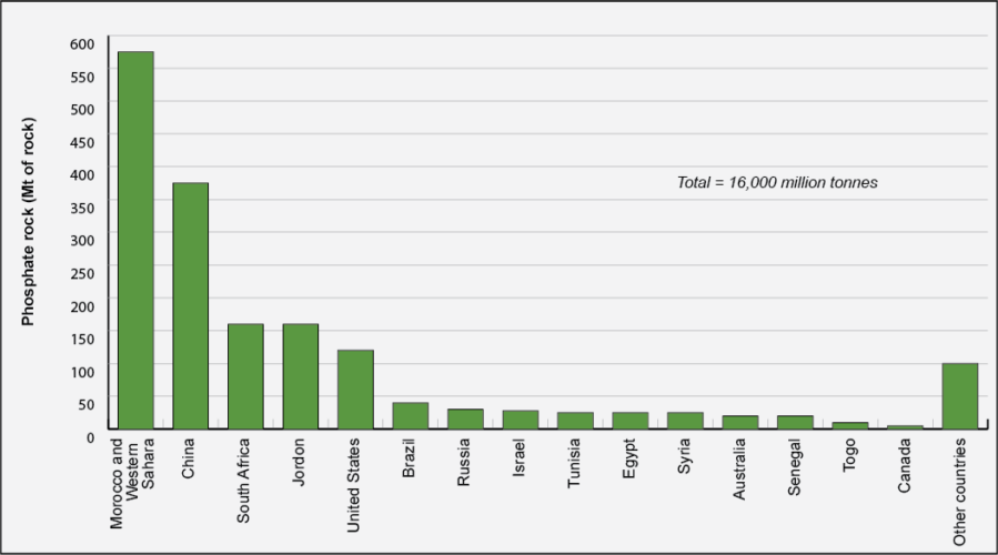 Phosphorus is derived from sedimentary or some igneous geologic deposits distributed across the globe. In North America, the largest deposits are in sedimentary materials in Florida, North Carolina, and in Eastern Idaho/Western Wyoming. The world’s largest phosphate reserves are found in Morocco. China and Russia are also major global suppliers of phosphate fertilizer. Apatite, a calcium phosphate mineral, is the primary phosphorus constituent in phosphate rock and is often mixed with clay, sand, and other minerals. Calcium phosphate, coincidentally, is also a key component of bones and teeth. Most phosphate rock is recovered through surface mining of these sedimentary deposits, although some is extracted from underground mines.