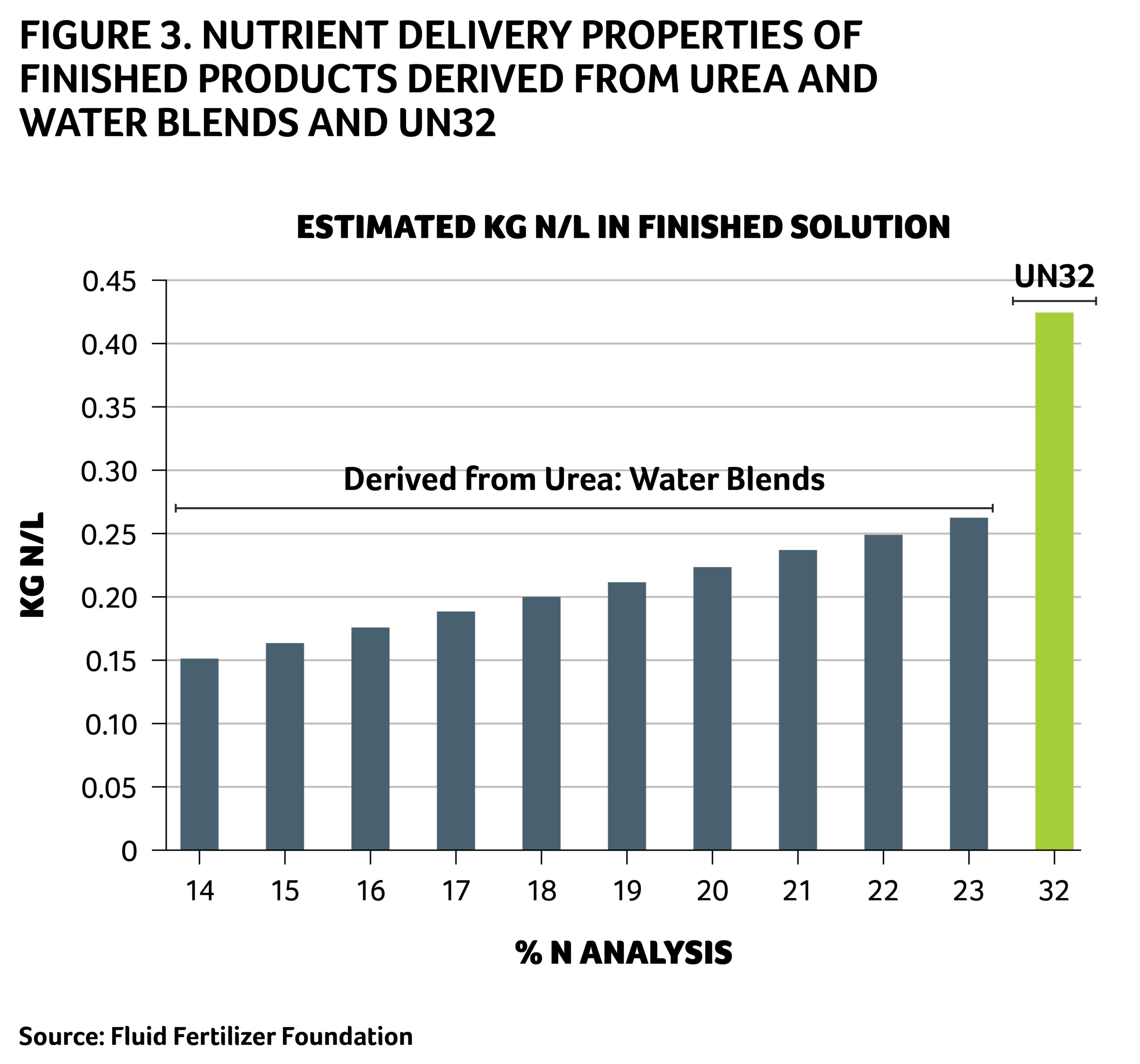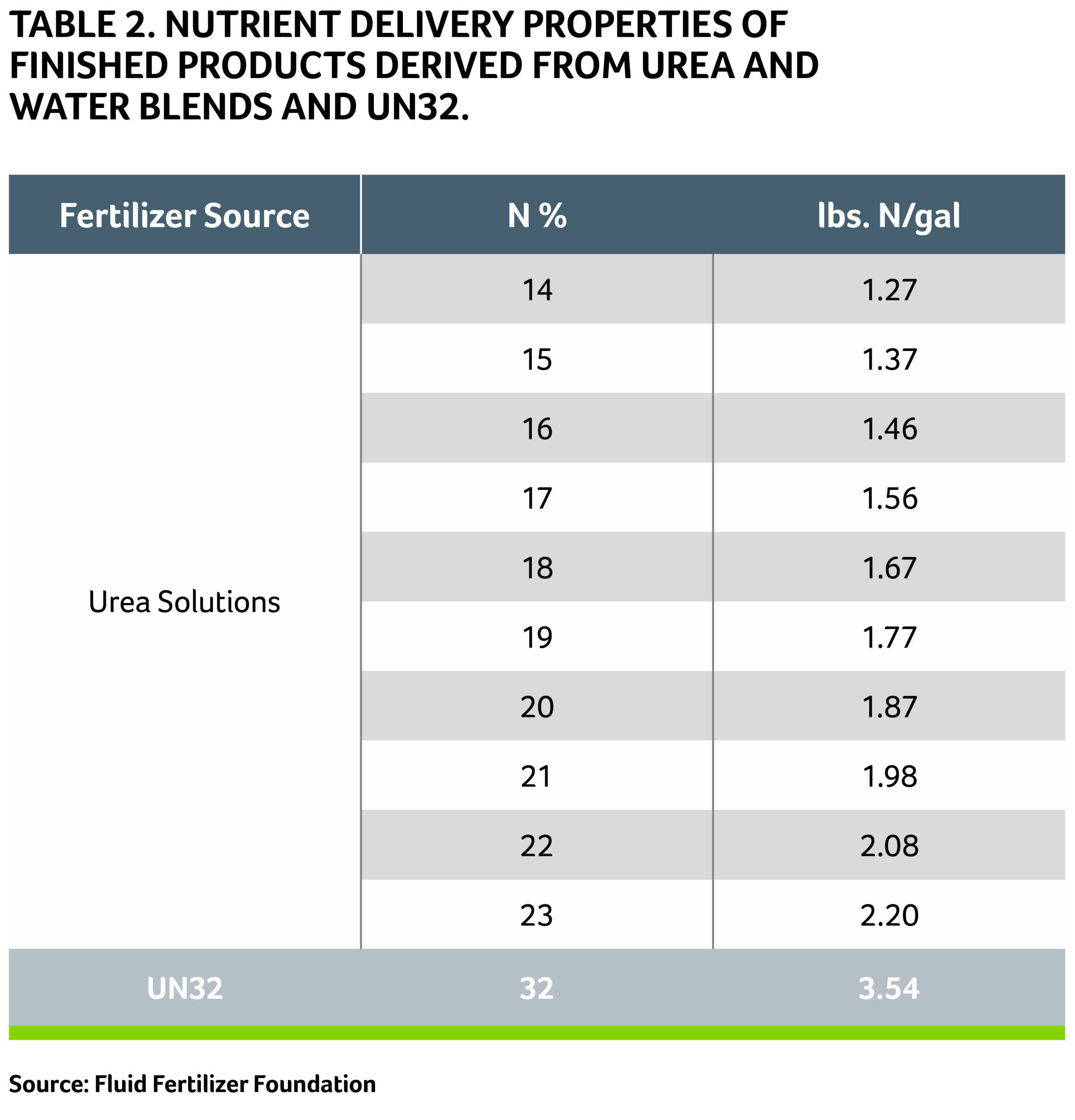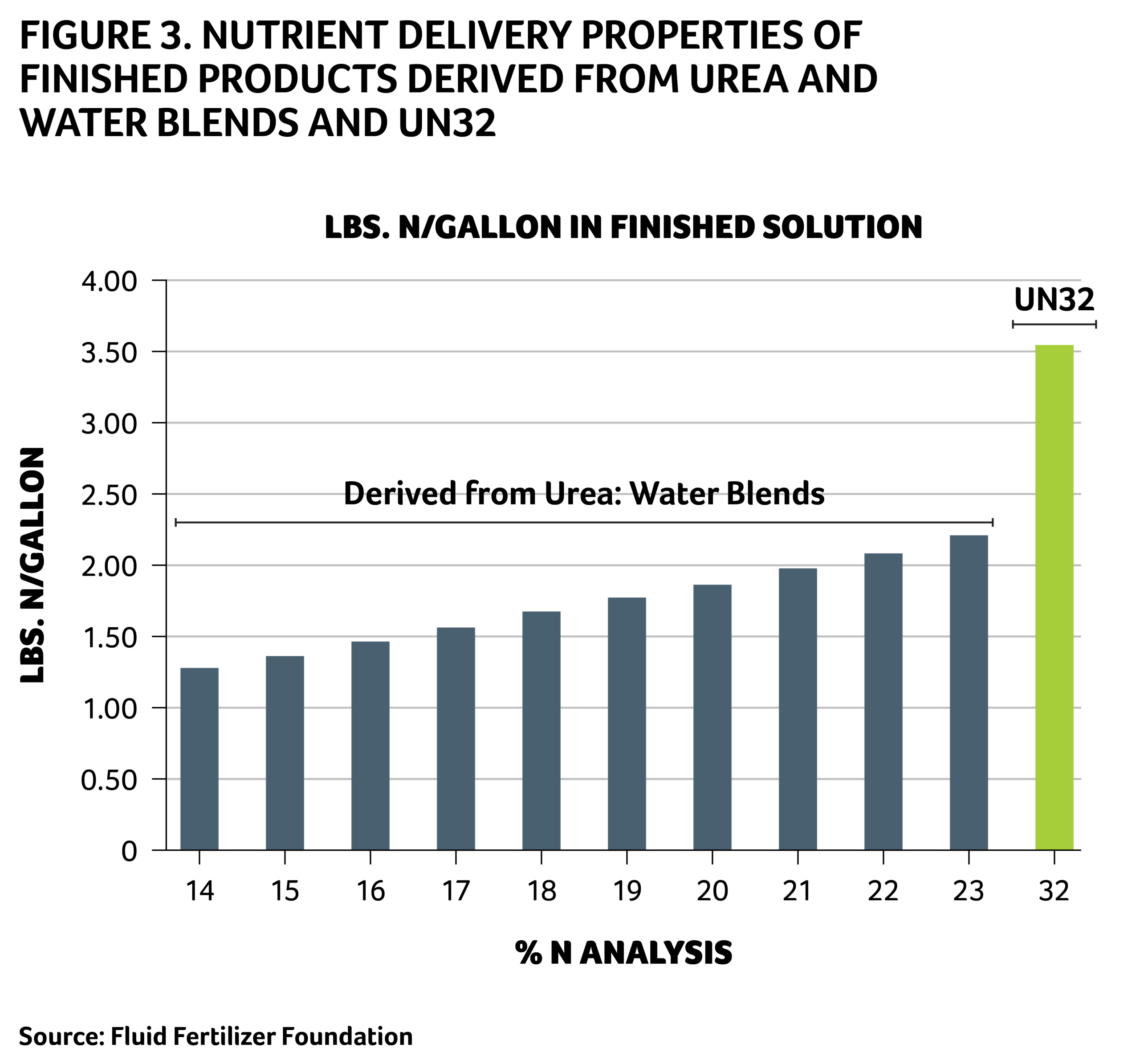 - UN32 has a relatively high lbs. N/gallon of finished product compared to urea:water solutions (Table 2, Figure 3).