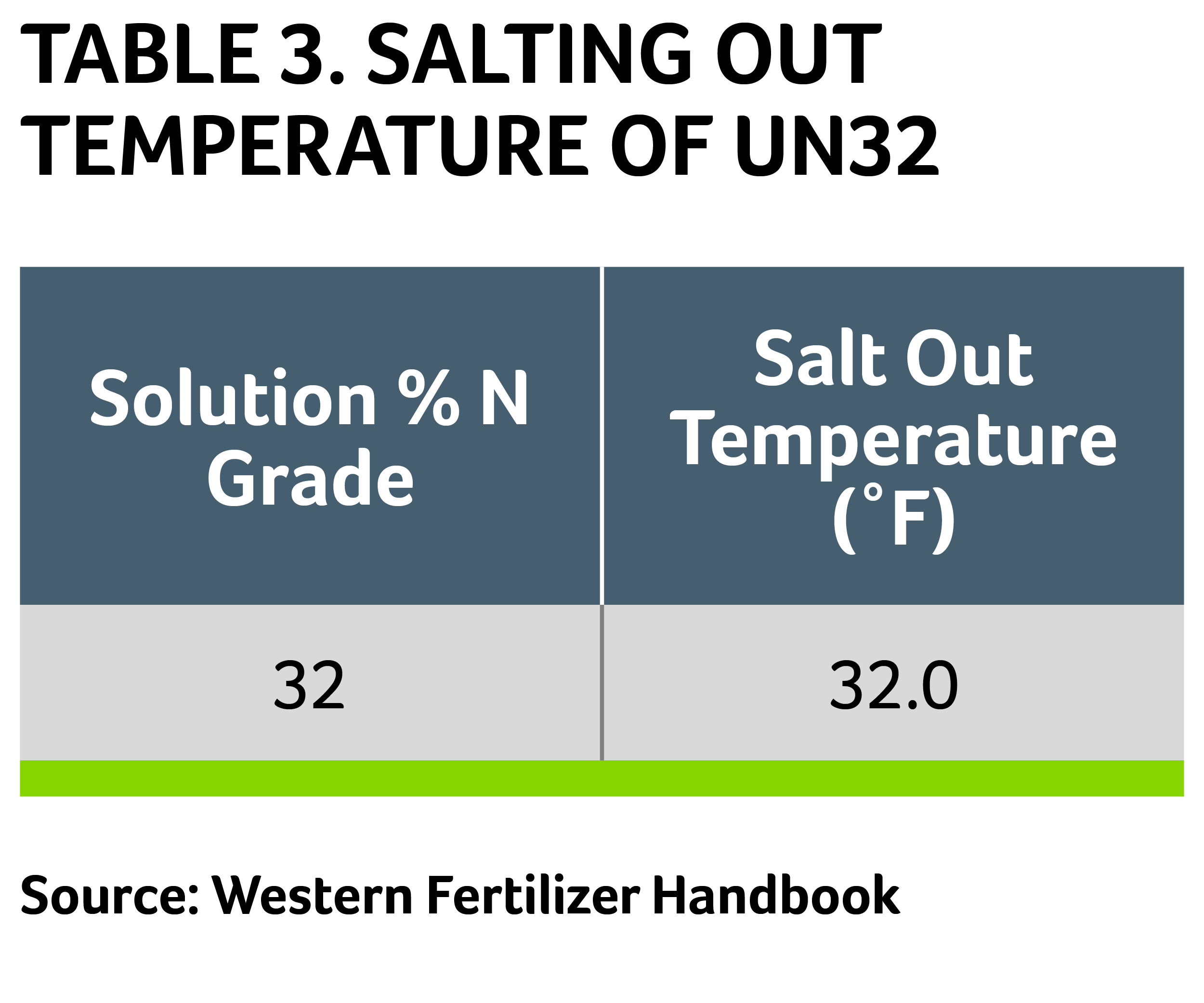 - Increasing the final nitrogen analysis (percentage of nitrogen) of the finished urea:water solution results in a proportional increase of the maximum salt out temperature where the urea falls out and separates from the water base. It’s important to note that at high analysis, the salt out temperature occurs under cool to ambient temperatures (Table 1, Figure 2). Careful monitoring of environmental conditions during extended product storage must take place to ensure the product does not separate out relative to UN32, which has a salt out temperature of 0°C/32°F (Table 3).