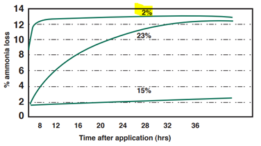 Research shows a 2-12 percent ammonia loss under dry soil conditions (yellow area below). When in doubt, inject the anhydrous ammonia at a deeper depth if losses are a concern. Most of the losses occur within the first six to eight hours after application and losses will eventually stabilize.