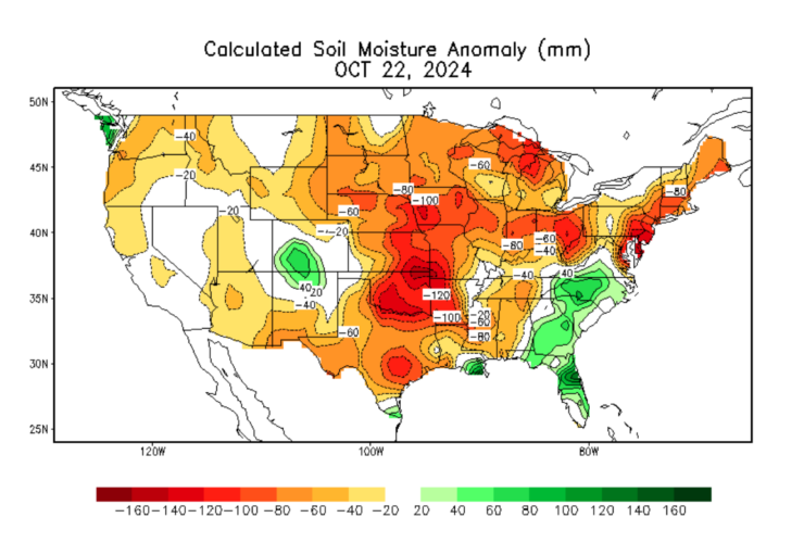Figure 1 & 2 – Dry soil conditions (shades of red) are observed across much of the growing areas in the United States. Source: Climate Prediction Center