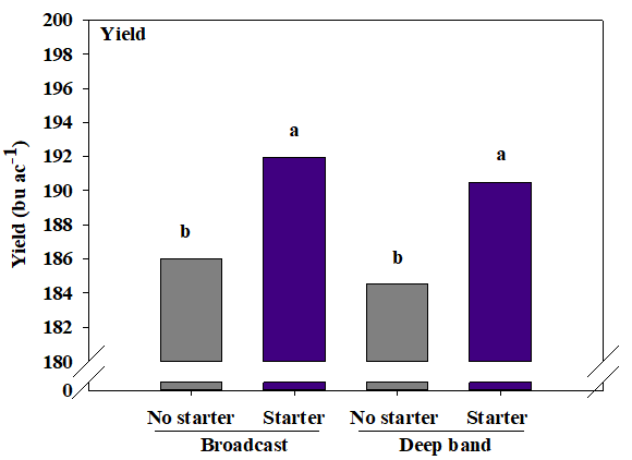 In Dr. Preston’s dissertation research, corn grain yields were shown to be significantly higher when applying a starter versus without over a ten-year period.
