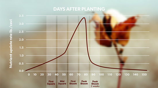 Because of this, new varieties use potassium before producers would typically make a side-dress application. Harris recommends that producers apply potassium earlier to ensure adequate potassium during the flowering stage, as potassium increases drastically during early boll set. Seventy percent of potassium uptake in cotton occurs around first bloom.