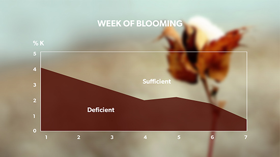 Harris recommends producers apply a full rate of potassium at pre-plant and be prepared to make two supplemental applications in season. Tissue testing of the cotton petiole can be used as a great tool for determining if additional potassium is required. When potassium is needed, cotton producers should consider applying 5 to 10 pounds of K2O per acre in two supplemental applications during the bloom growth stage. The applications should be made two weeks apart and be finished by the eighth week of bloom. As seen in Figure 2, greater potassium concentrations in the petiole during the early bloom stages decrease as the plant progresses into maturity.